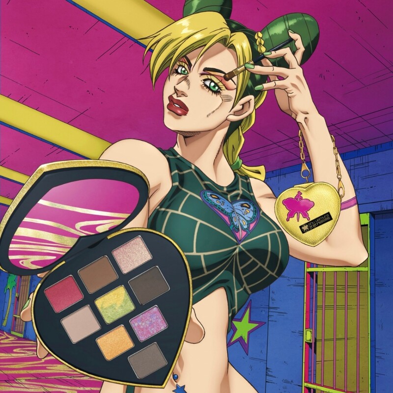 shu uemura X JOJO的奇妙冒险限量联名彩妆系列模特儿主视觉。 今年同样吸睛,首度携手《JOJO的奇妙冒险-石之海》,以动画女主角空条徐伦(JOLYNE CUJOH)和她的父亲空条承太郎(JOTARO CUJOH)为主,致敬了原作之余并使用华丽的金色与桃红撞色,打造一系列精彩彩妆。